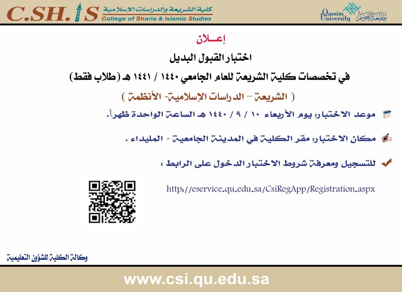 كلية الشريعة والدراسات الإسلامية بجامعة القصيم Su Twitter اختبار القبول البديل في تخصصات الشريعة الدراسات الإسلامية الأنظمة لمن فاته الاختبار الأول الذي ع قد ولديه عذر مقبول وي شترط 1 عدم دخول الاختبار الأول الذي ع قد بتاريخ
