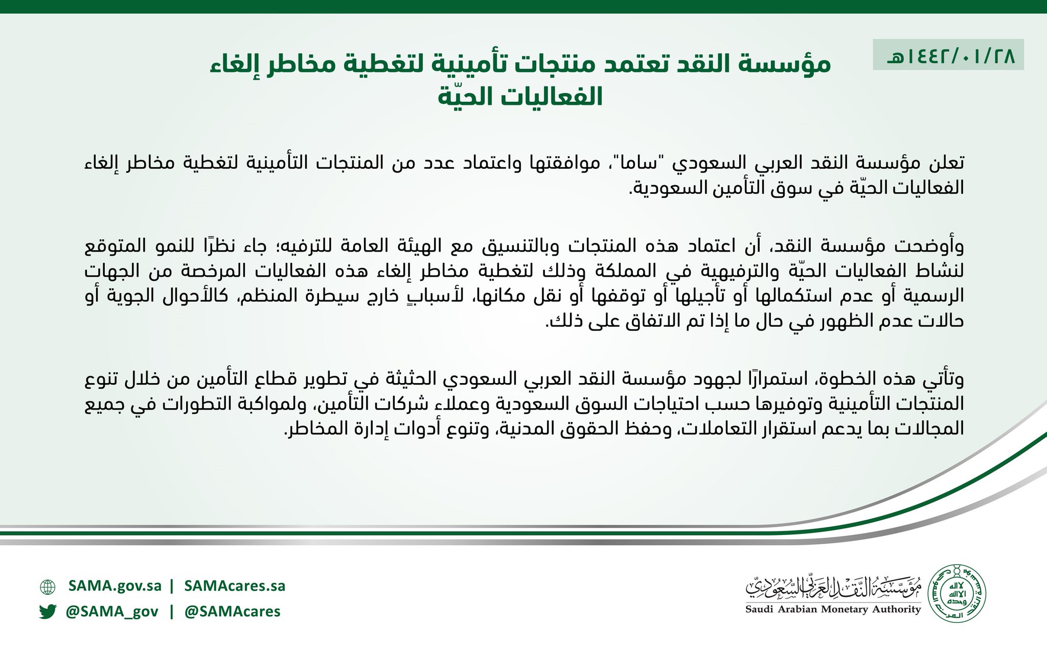 Sama مؤسسة النقد العربي السعودي On Twitter مؤسسة النقد تعتمد منتجات تأمينية لتغطية مخاطر إلغاء الفعاليات الحي ة Https T Co Dm5zflqq5o Sama