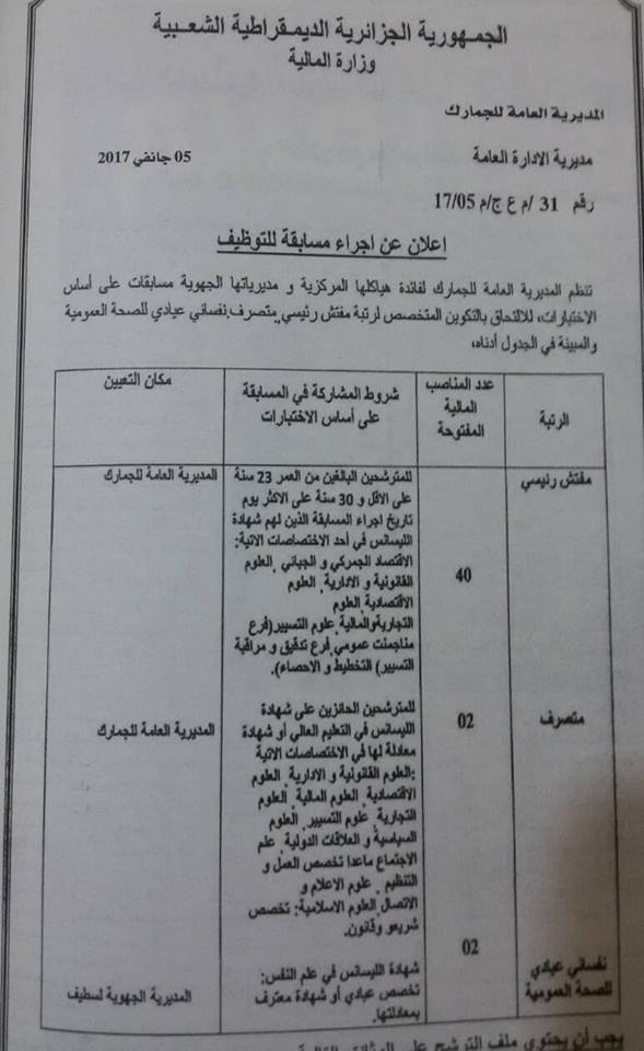 عن فتح باب التوظيف للسنة المالية 2020 لفائدة مؤسساتنا العقابية في الرتب المبينة في الجدول. 20 أكتوبر 2020 آخر أجل. وظائف الجمارك 2020 الجمارك توظيف 1441.