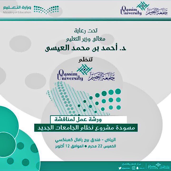 وافي عبد الله On Twitter تخت رعاية وزير التعليم ورشة عمل لمناقشة مسودة مشروع نظام الجامعات الجديد تقيمه غدا جامعة القصيم بفندق رافال كمبنكسي Https T Co T71rnmc68v