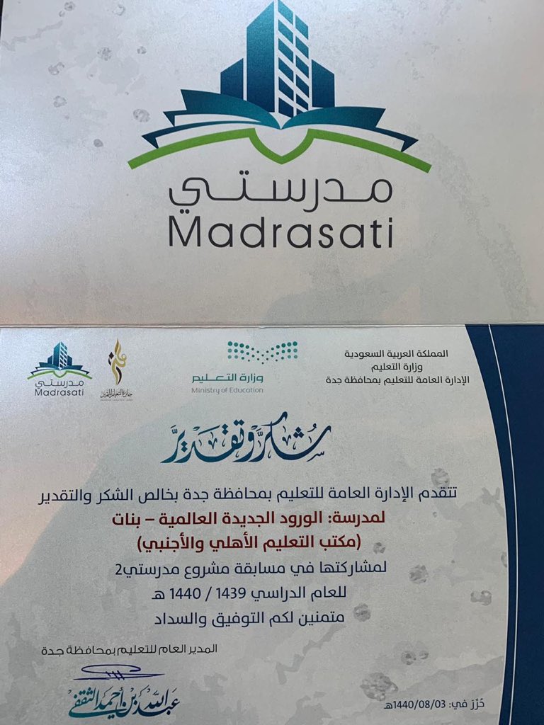 Nawis مدرسة الورود الجديدة العالمية Auf Twitter بفضل من الله تم تكريمنا من إدارة تعليم جده ومكتب التعليم الاهلي في مسابقة مشروع مدرستي ٢